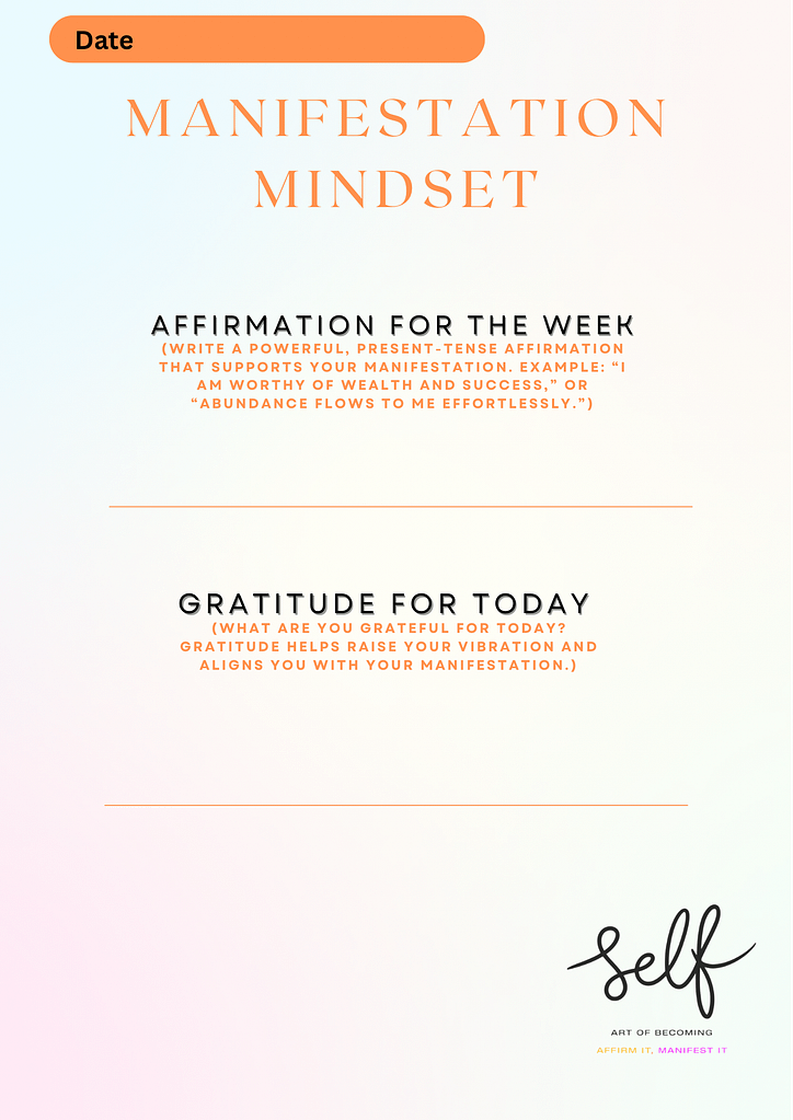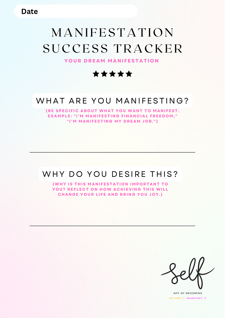 At Self: Art of Becoming, we believe in empowering you to unlock your fullest potential and create the life you deserve. To support your journey, we’re excited to offer you exclusive, free resources designed to enhance your manifestation practice and personal growth.
